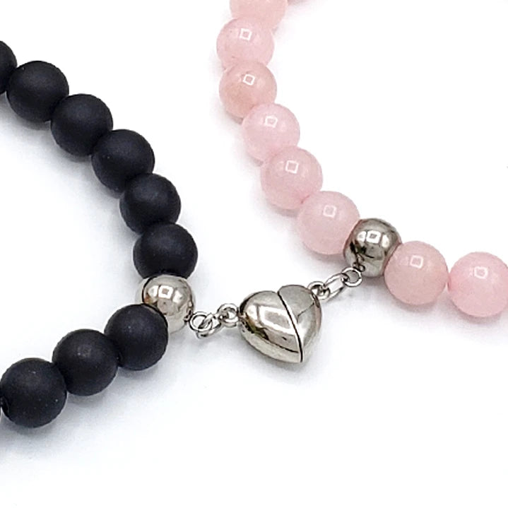 Pulseras para Parejas Piedras Ónix Mate Cuarzo Rosado Corazón Imantado